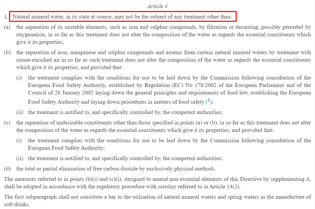 记者注意到,欧盟的该项指令规定,在不改变基本成分的情况下,除了通过过滤或倾析分离不稳定元素,通过用富含臭氧的空气分离铁、锰和硫化合物以及砷,以及通过物理方法消除游离二氧化碳之外,天然矿泉水不得进行其他任何处理。