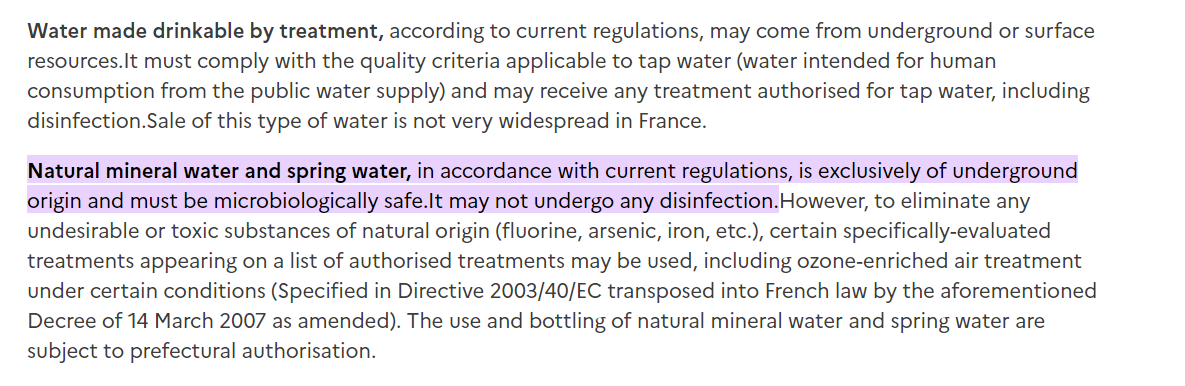 按法国国家食品、环境和职业健康安全局(ANSES)的规定,“天然矿泉水”指的是天然纯净的水,可以直接饮用,标注“泉水”或“天然矿泉水”字样的瓶装水,应该来自保存完好的地下水资源,是非常纯净的天然水,不得进行消毒。
