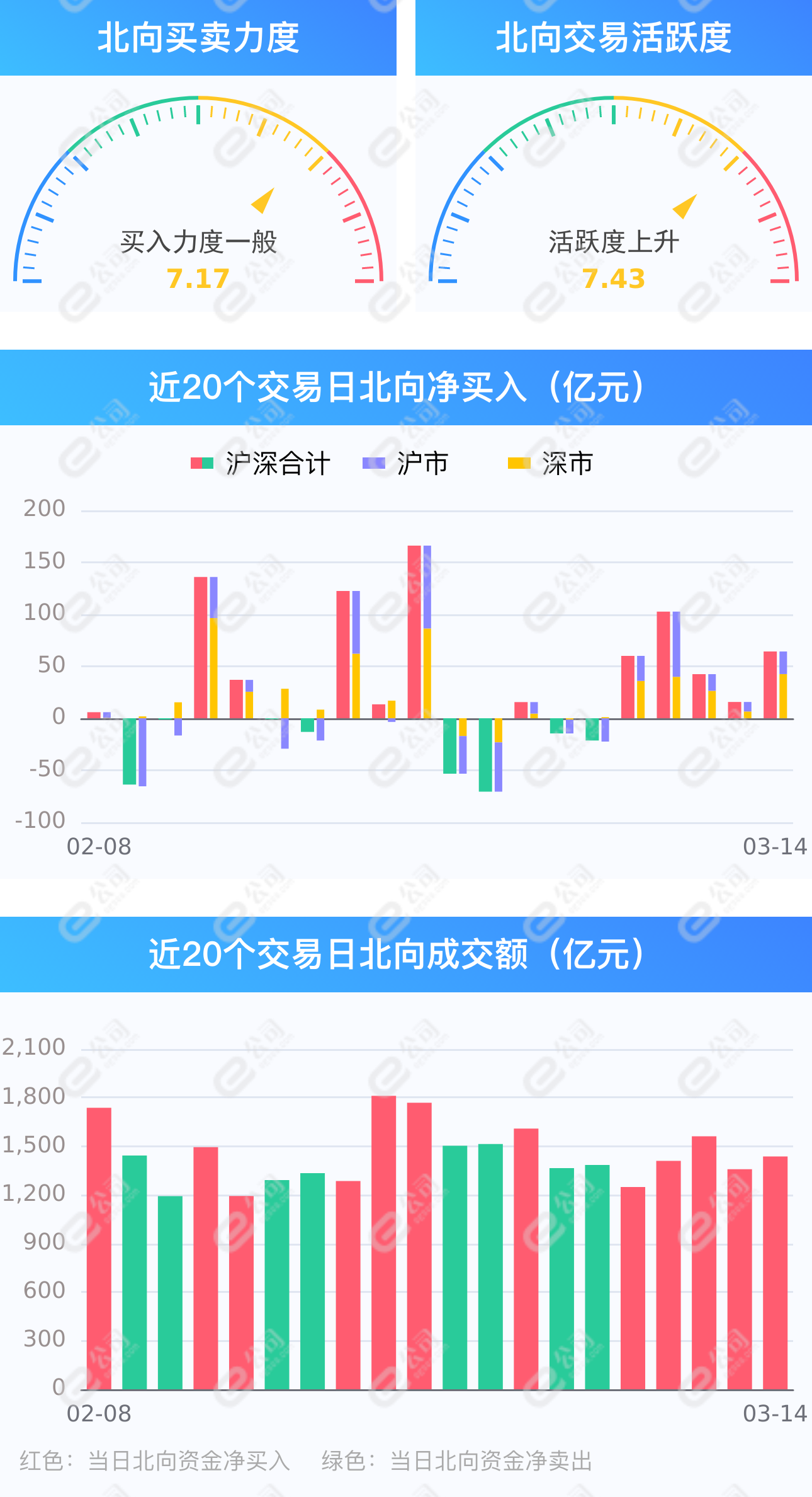 证券时报e公司讯,3月14日,截至A股收盘,统计数据显示北向资金合计净买入64.22亿元,其中沪股通净买入42.48亿元,深股通净买入21.74亿元。北向资金成交金额1436.78亿元,占A股总成交额14.26%,交易活跃度上升5.82%,其中沪股通买入金额352.10亿元,卖出金额309.62亿元,深股通买入金额398.40亿元,卖出金额376.66亿元。北向资金保持连续5日净买入,净买入额分别为60.01亿元、102.60亿元、42.44亿元、15.67亿元、64.22亿元,合计净买入284.94亿元。